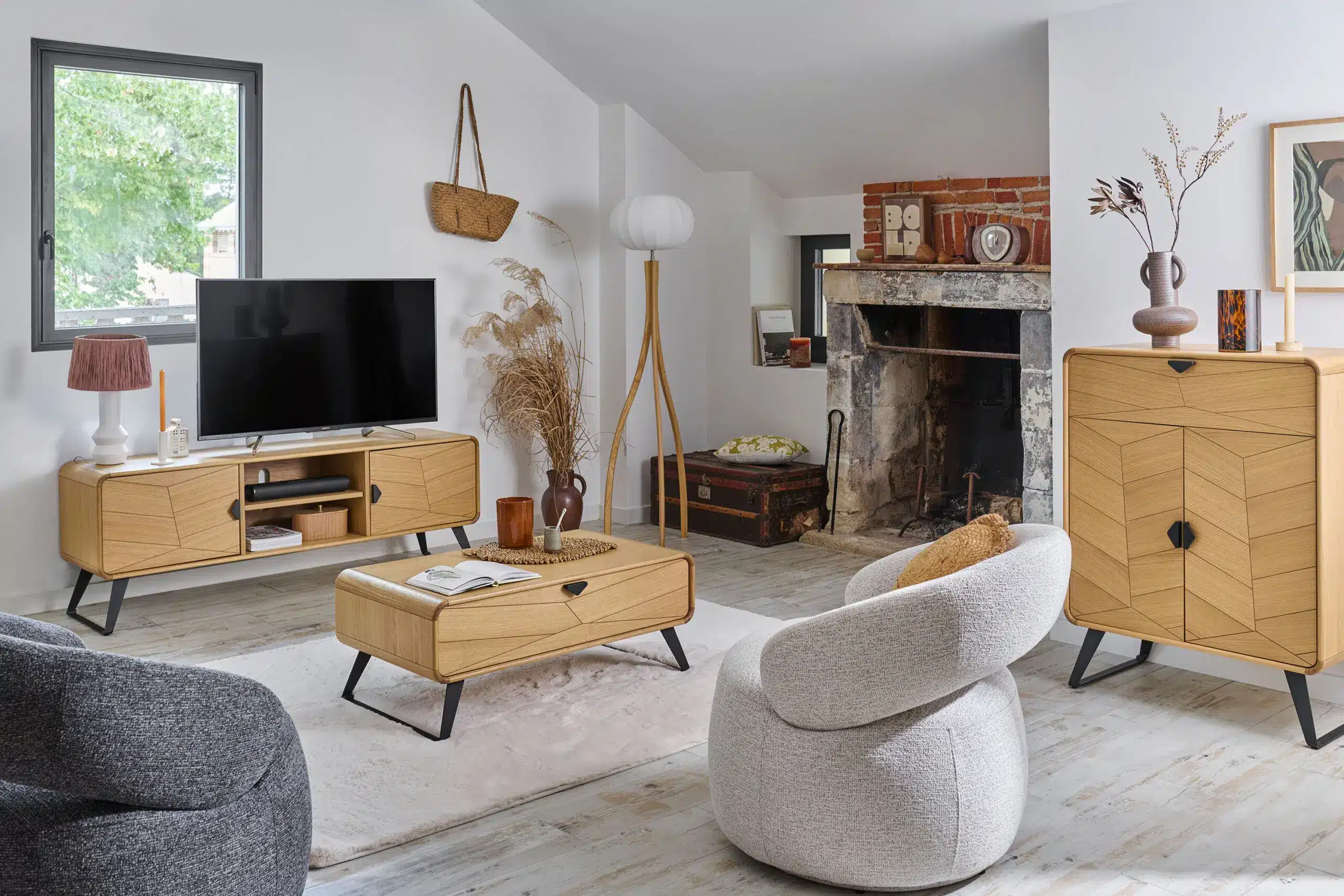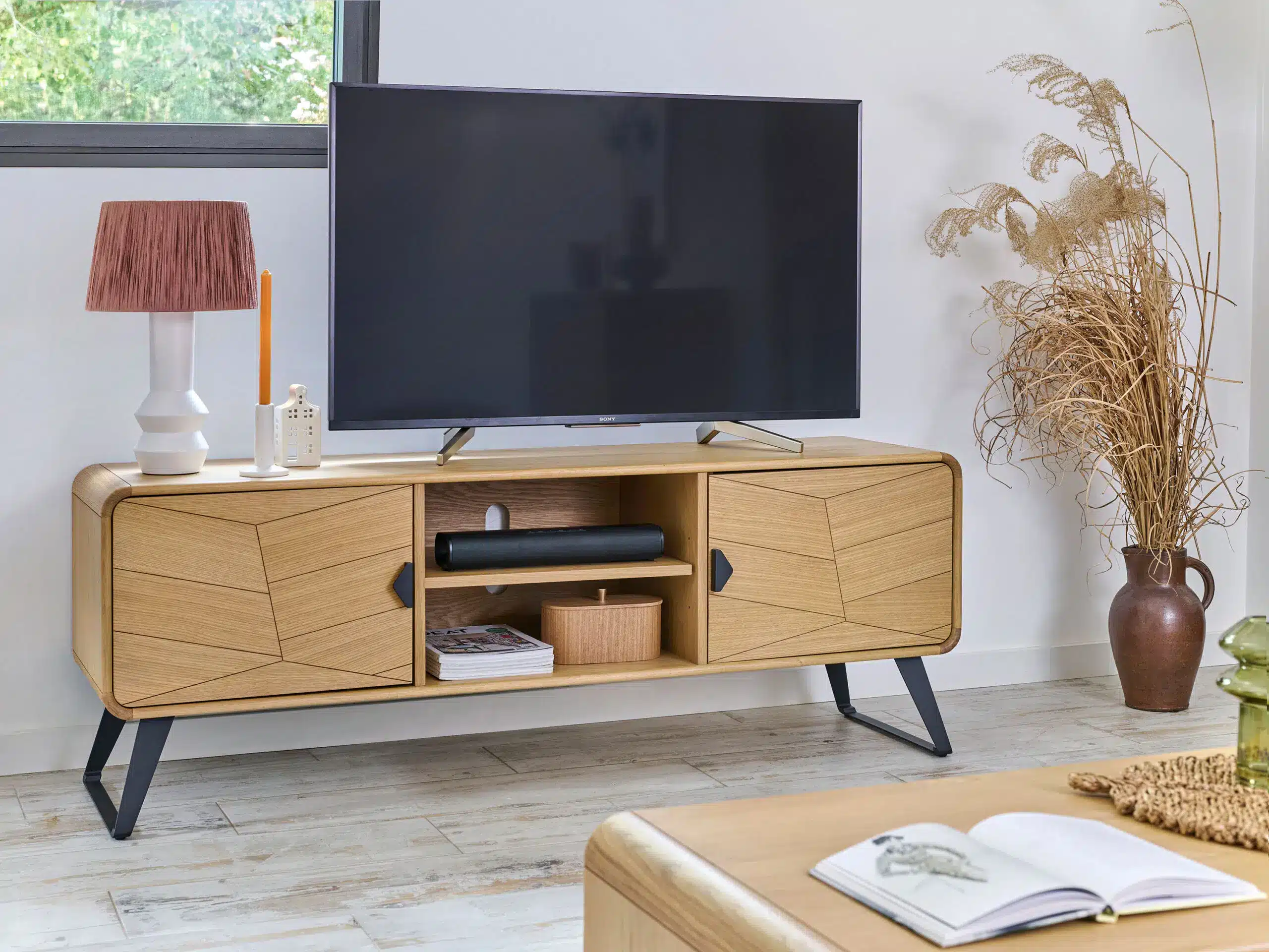 Le meuble TV Hifi 165 cm Tokyo affirme son style avec son décor façon chevron, mis en valeur par un placage chêne chaleureux et des arrondis en bois massif. Ses lignes équilibrées s’intègrent parfaitement dans un salon de mobilier contemporain, en dialogue avec une table de salon, une enfilade en bois ou un fauteuil de salon aux formes modernes. Son piètement en fer finition époxy lui confère une stabilité discrète et élégante.